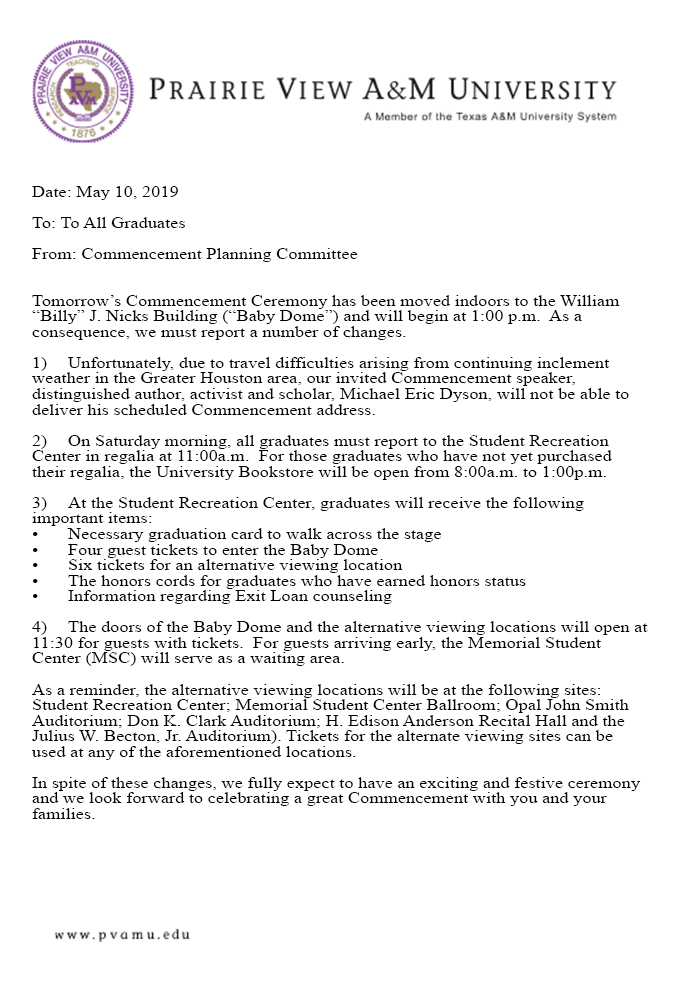 Updated Message Regarding Commencement Ceremony