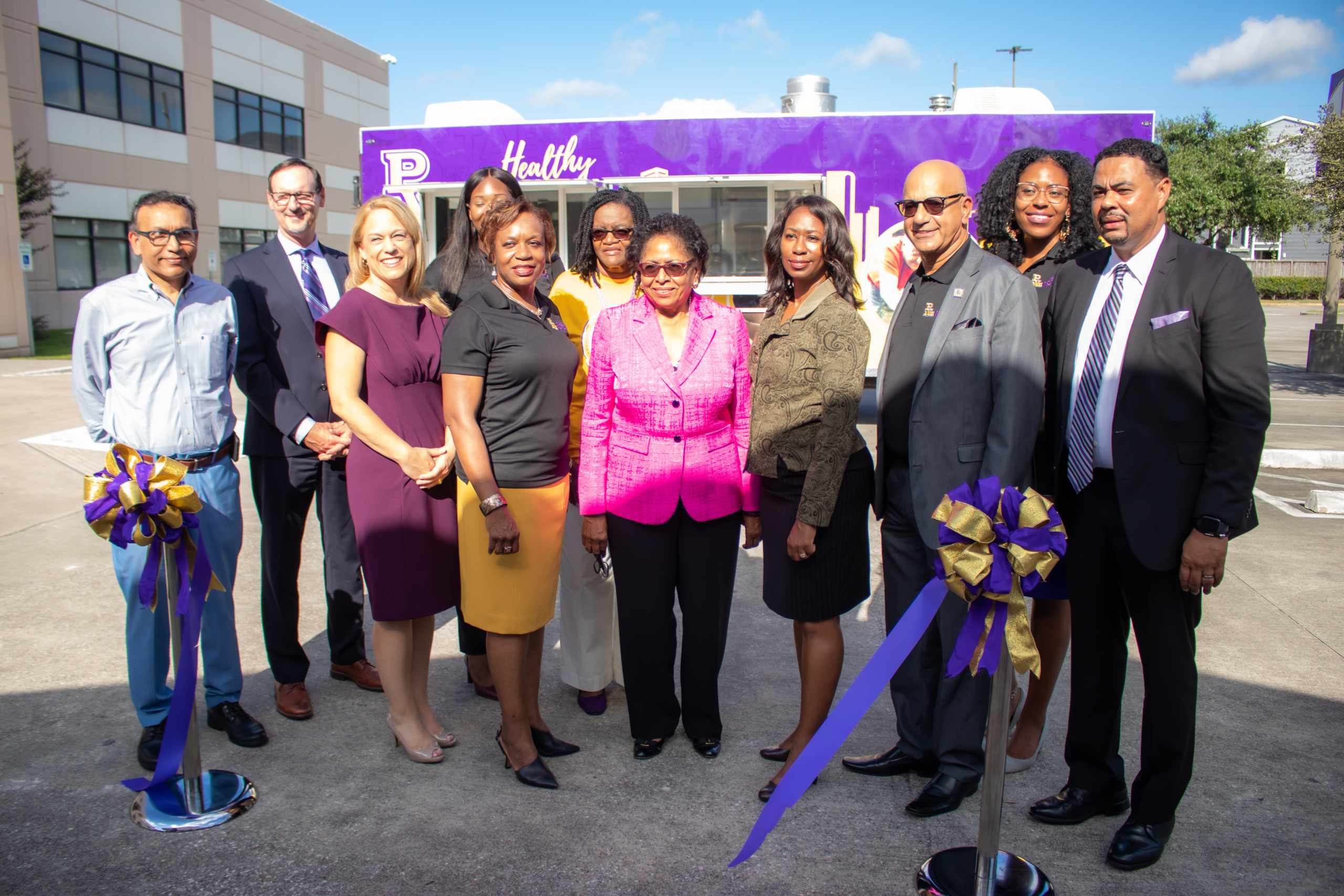 The unit ā adorned in PVAMUās signature purple and gold ā features an industrial-sized refrigerator, two sinks, two 4-burner gas stovetops, and a double-stack propane convection oven. It will be used at HHI events to conduct cooking demonstrations with healthy food products taken from community gardens.