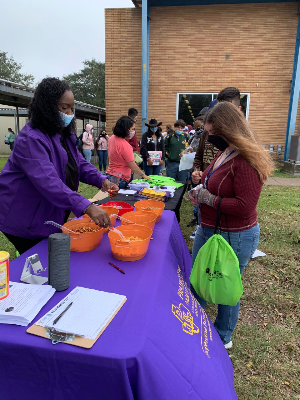 Students received goodie bags with educational materials about local resources, items from PVAMU CEP, healthy recipes, Red Ribbon Week drug information, donated hygiene materials, and school supplies. Middle and high school students also received individual bags of customized trail mix as a healthy snack.