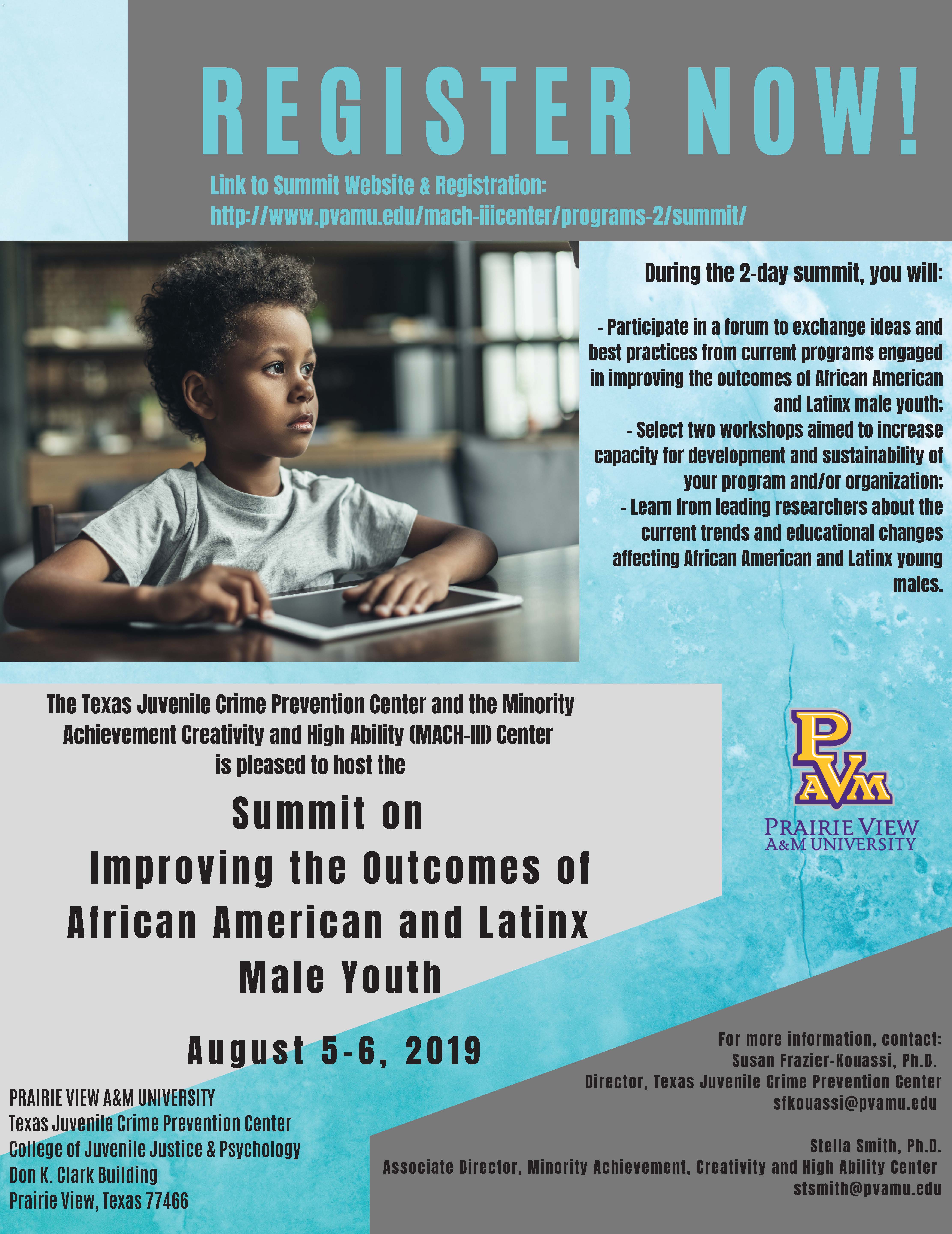 On August 5-6, 2019, the Texas Juvenile Crime Prevention Center and the Minority Achievement Creativity and High Ability (MACH-III) Center at Prairie View A&M University will host a two-day, Summit on Improving the Outcomes of African American and Latinx Male Youth.