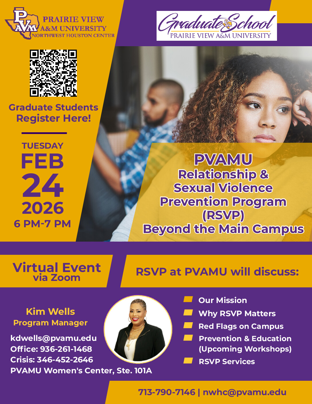 PVAMU Relationship & Sexual Violence Prevention Program (RSVP) Beyond the Main Campus Attention Graduate Students! We invite you to participate in another engaging virtual session tomorrow, February 24, 2026, at 6:00 PM, on Zoom. Ms. Kim Wells will be discussing RSVP Beyond the Main Campus and sharing valuable information. Please click the link below to […]