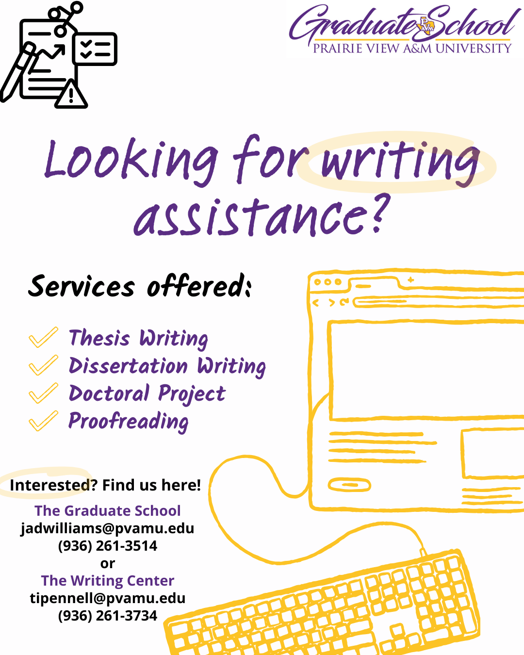 Graduate School Writing Support – Graduate School Writing Support – At the PVAMU Graduate School, we emphasize that Writing is for Life! Writing assistance is available through scholarly writing workshops and individual writing consulting, whether you are writing a thesis, dissertation, policy brief, or creative works. See our calendar for Scholarly Writing Workshop dates. Individual Writing Consulting is available by appointment. Please contact the Graduate School Writing Support: