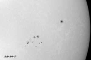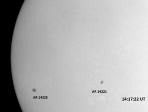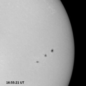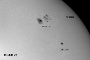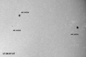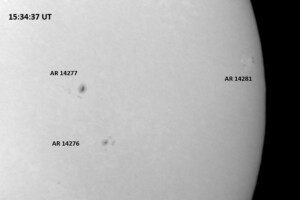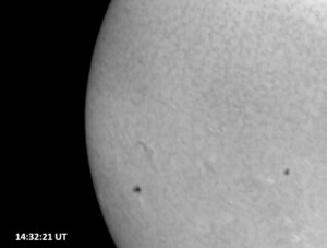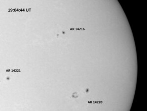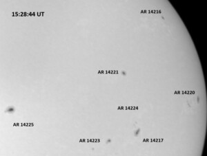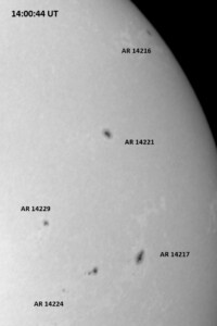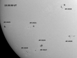 The power cord for the H-alpha filter was unavailable so only continuum images were taken during one short session today. The below is two copies of the same field of view, which includes all but one of the active regions currently visible on the solar disk. The image was taken at the time indicated and is shown in both labeled and un-labeled format. The image, a 0.25 second exposure, covers 13.8’x18.0′ on the Sun.