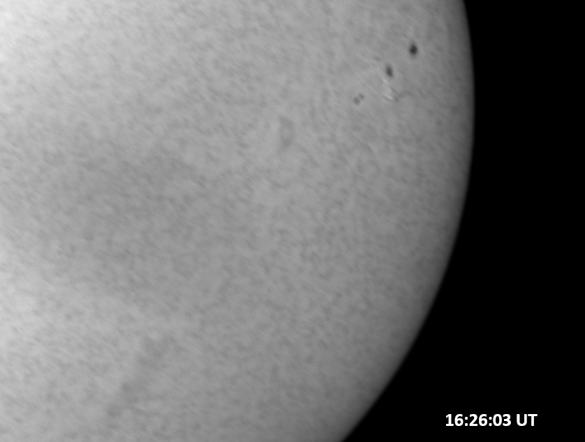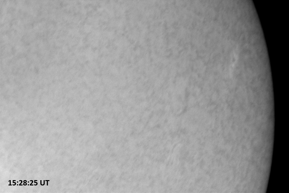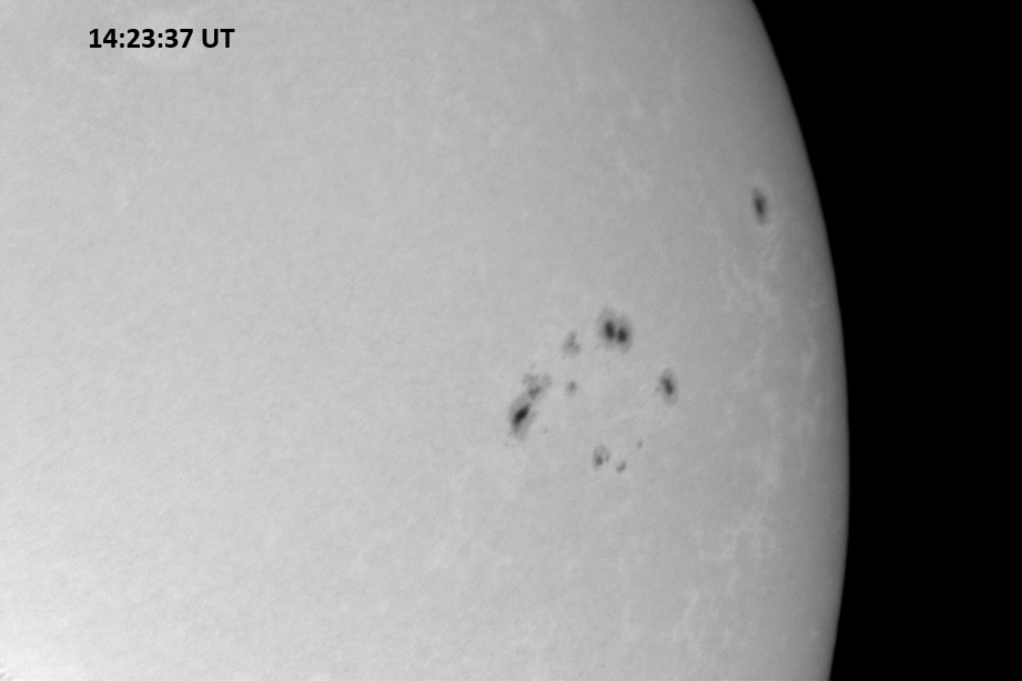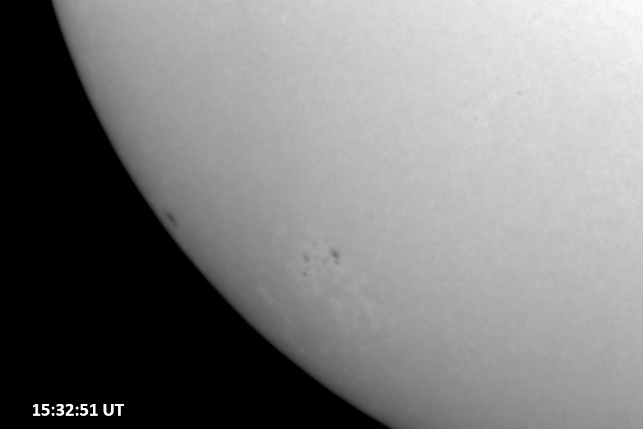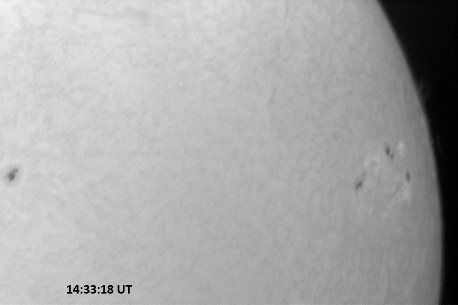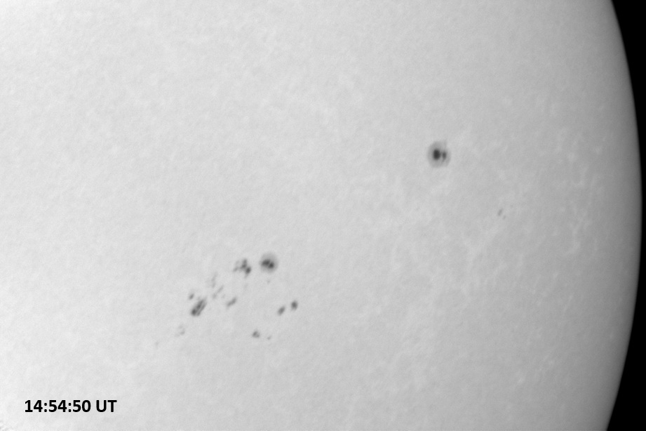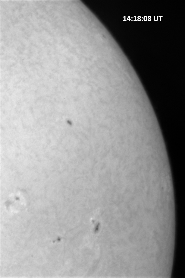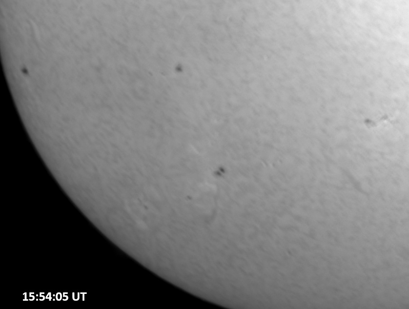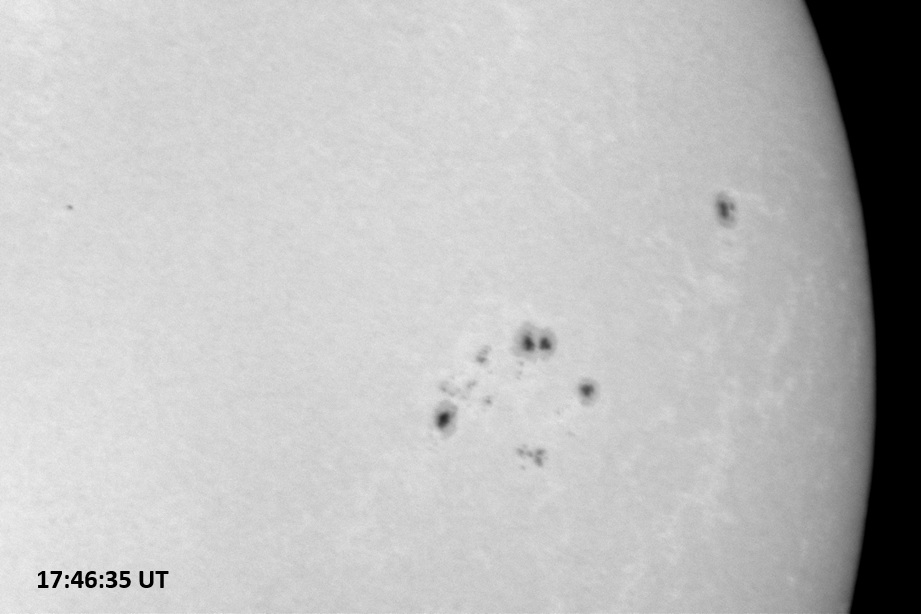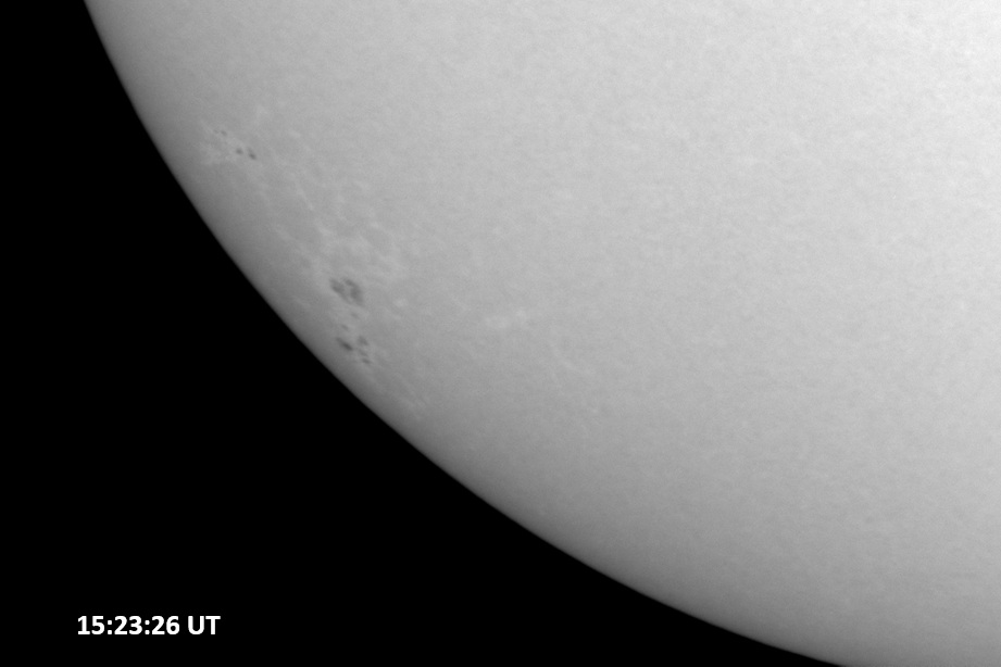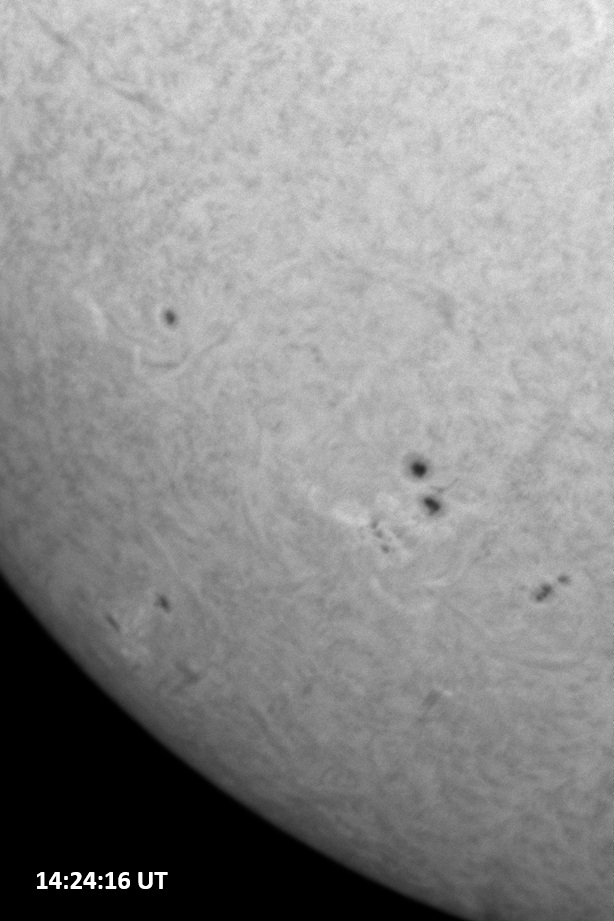 Weather was cloudy today but the clouds thinned enough to allow the Sun to shine through fairly strongly. This was enough for a complete set of continuum images, although they were made through cirrostratus clouds of varying thickness. H-alpha imaging was attempted, unsuccessfully, due to even the presence of thin clouds greatly reducing the contrast.