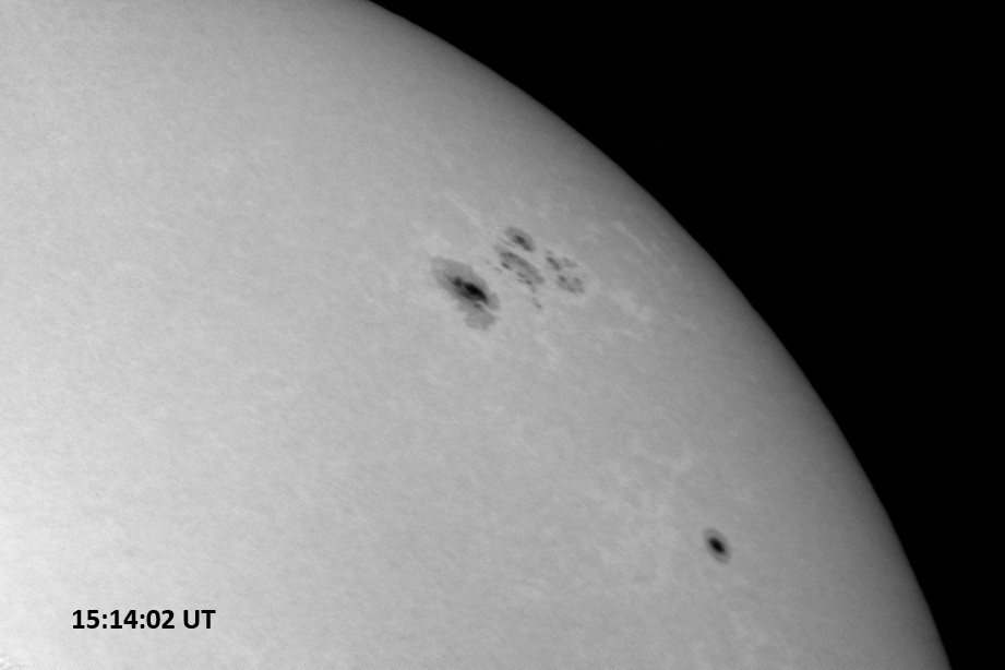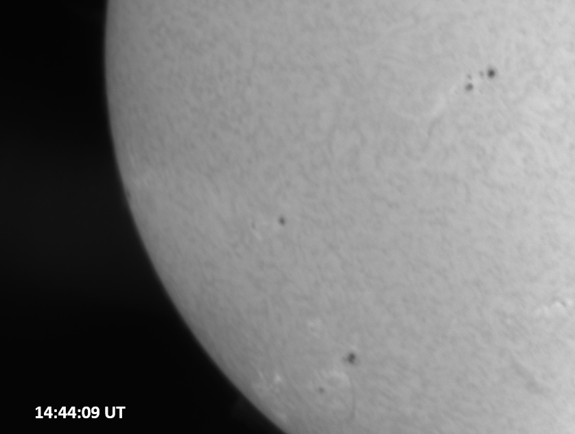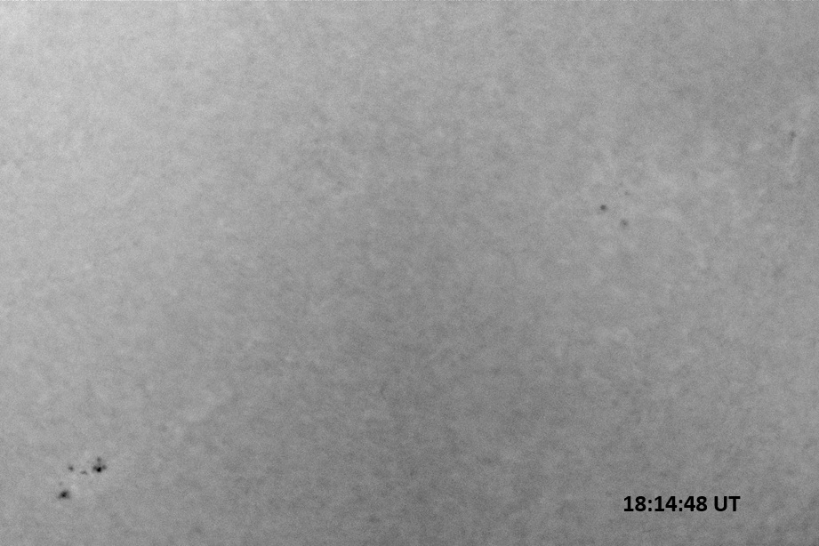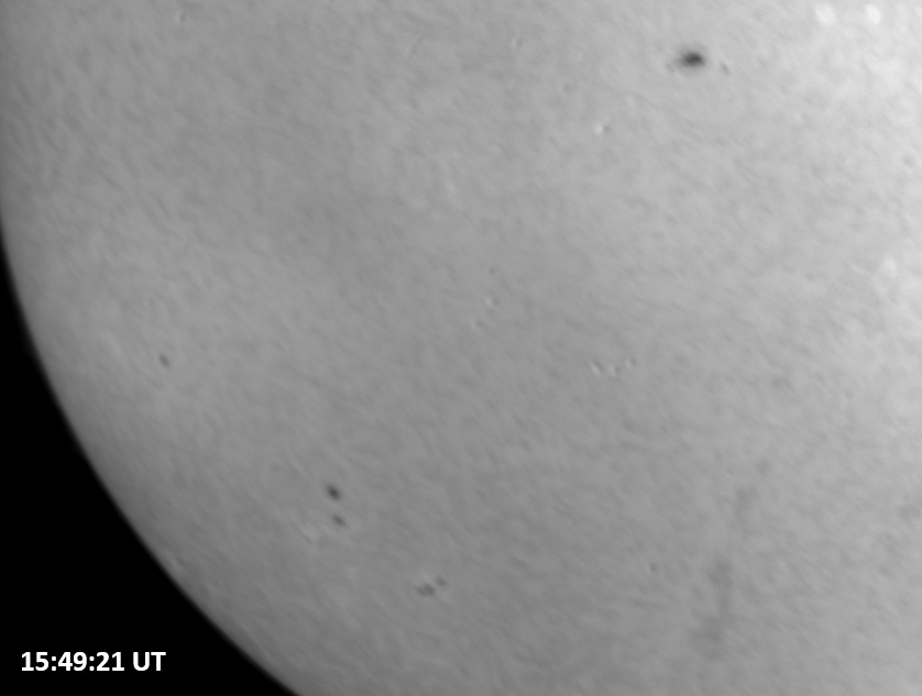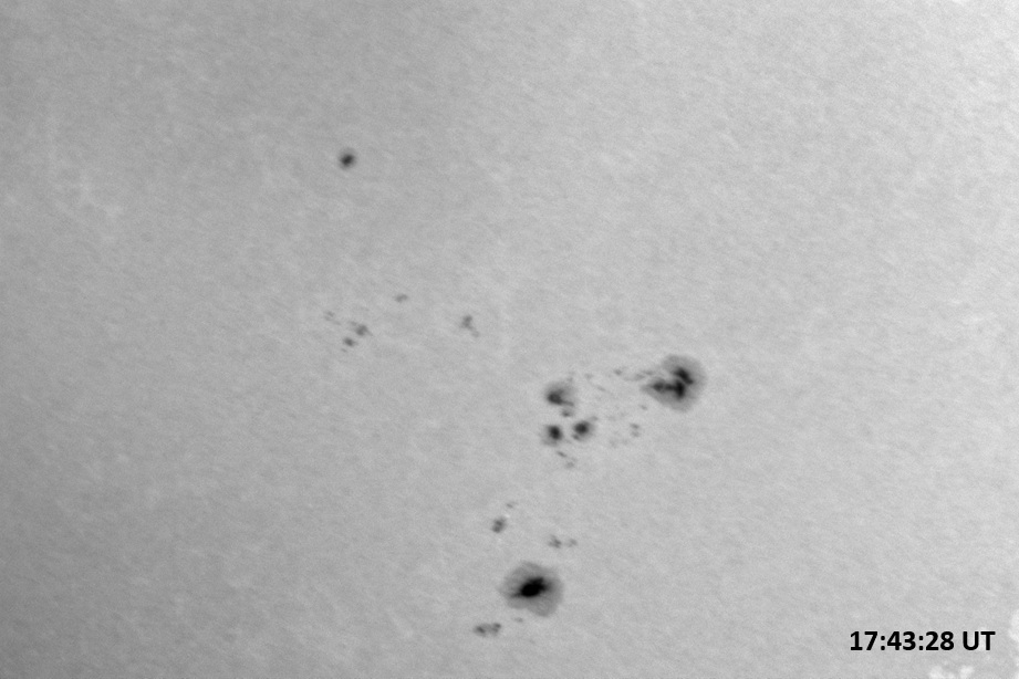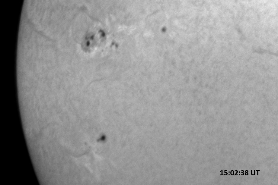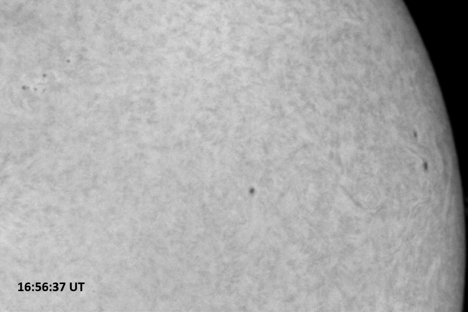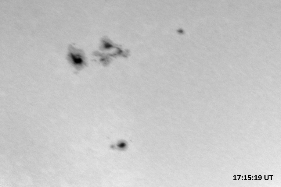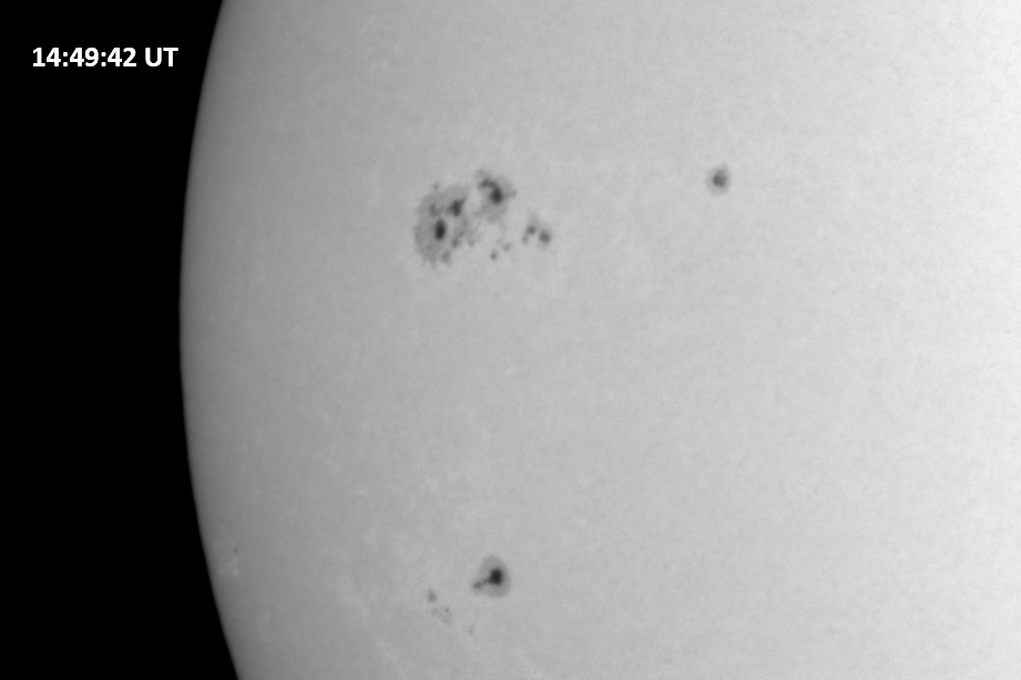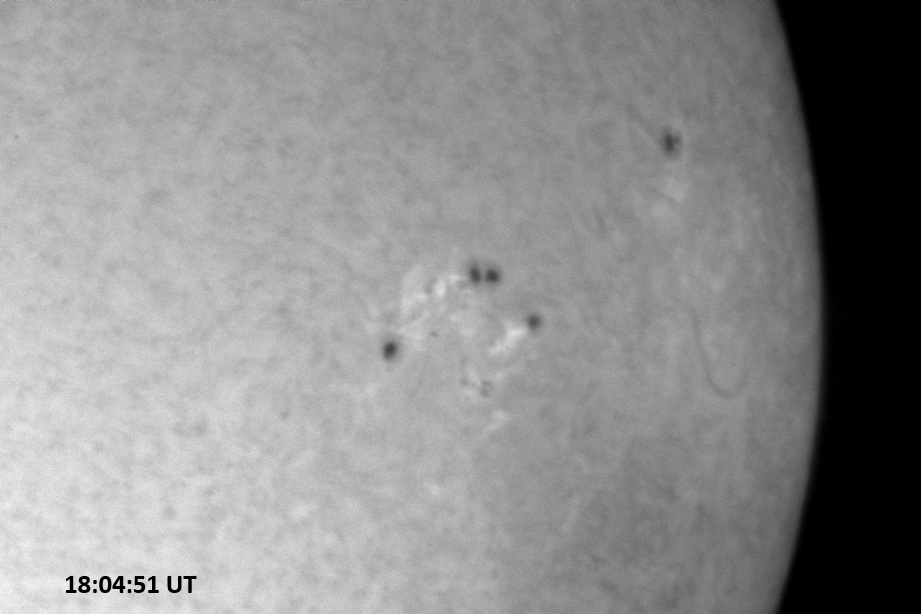 Weather was cloudy today but the clouds thinned enough to allow the Sun to shine through fairly strongly. This was enough for a complete set of continuum images, although they were made through cirrostratus clouds of varying thickness. H-alpha imaging was attempted, unsuccessfully, due to even the presence of thin clouds greatly reducing the contrast.