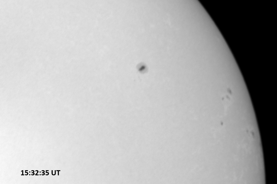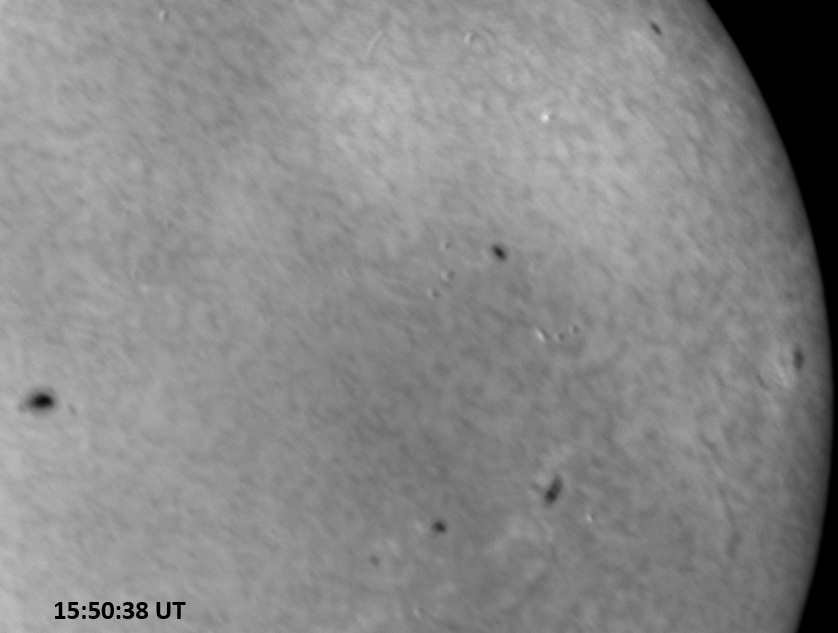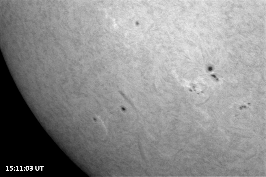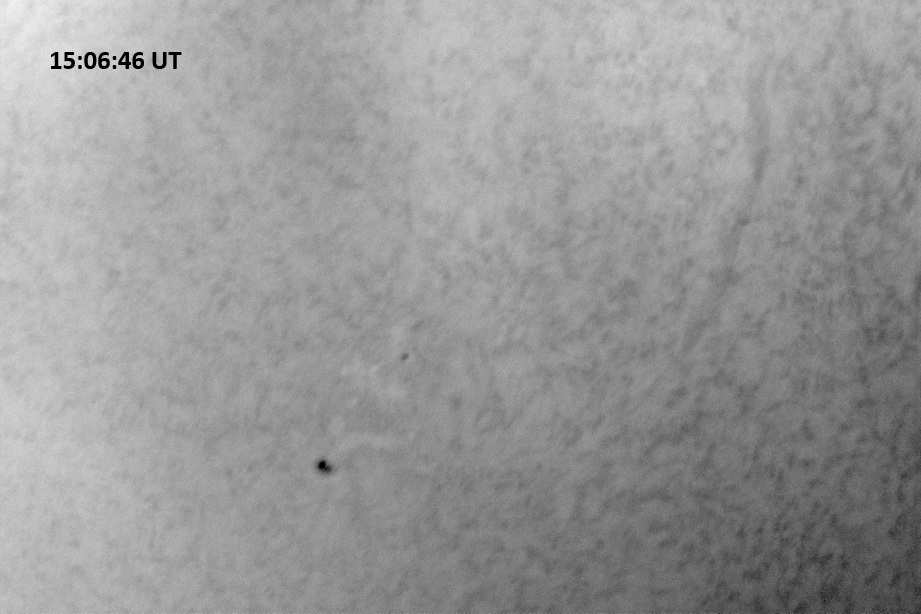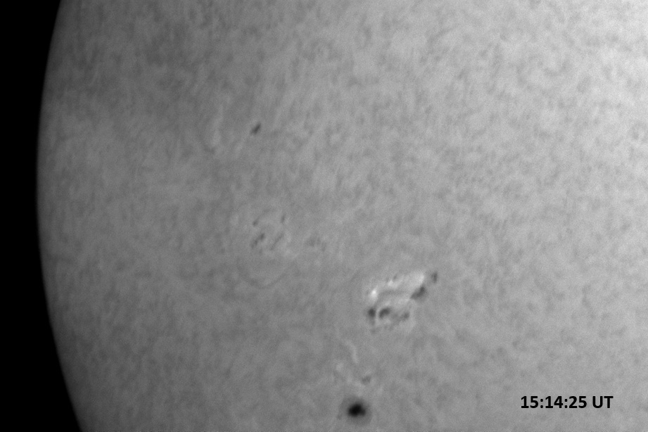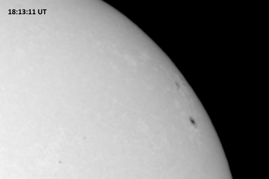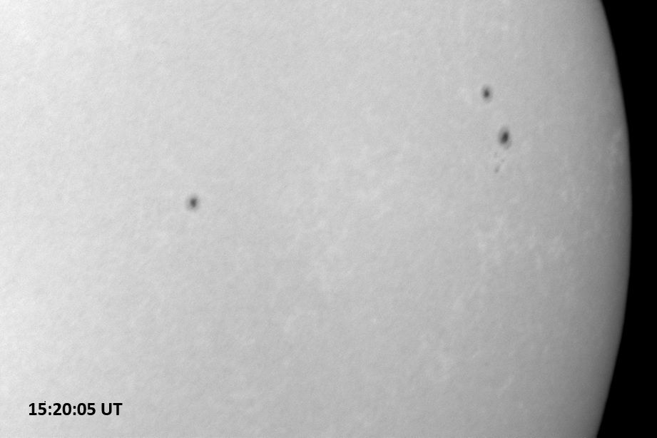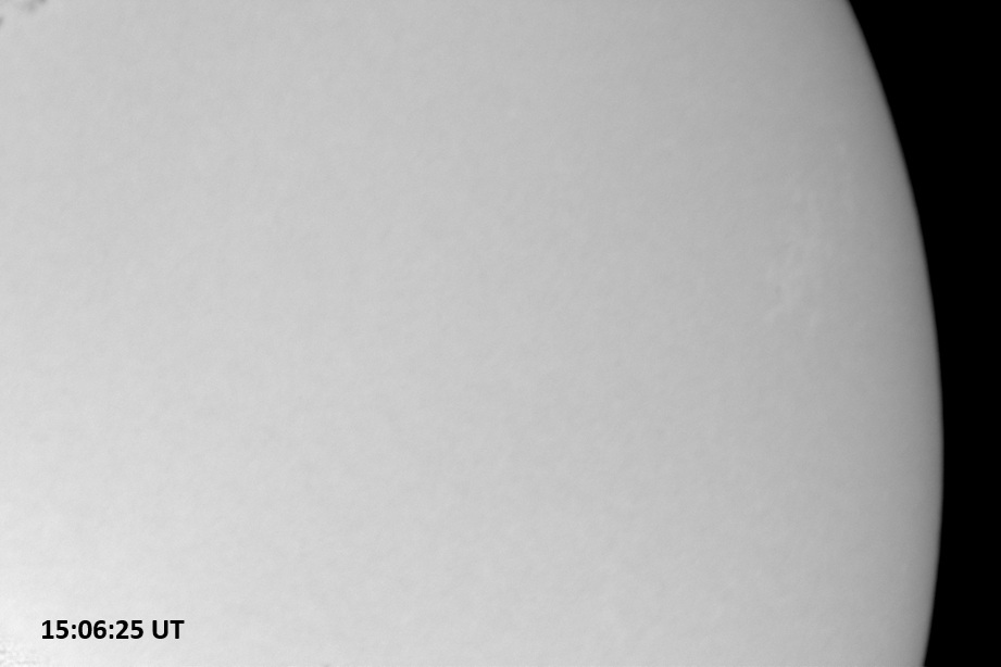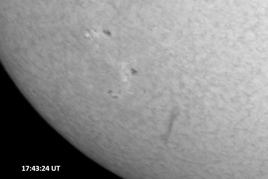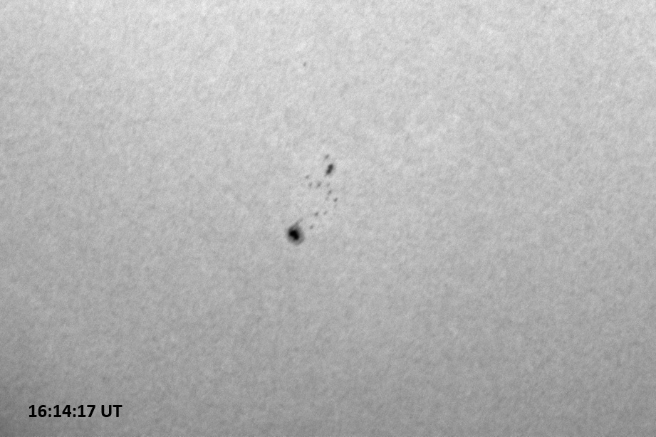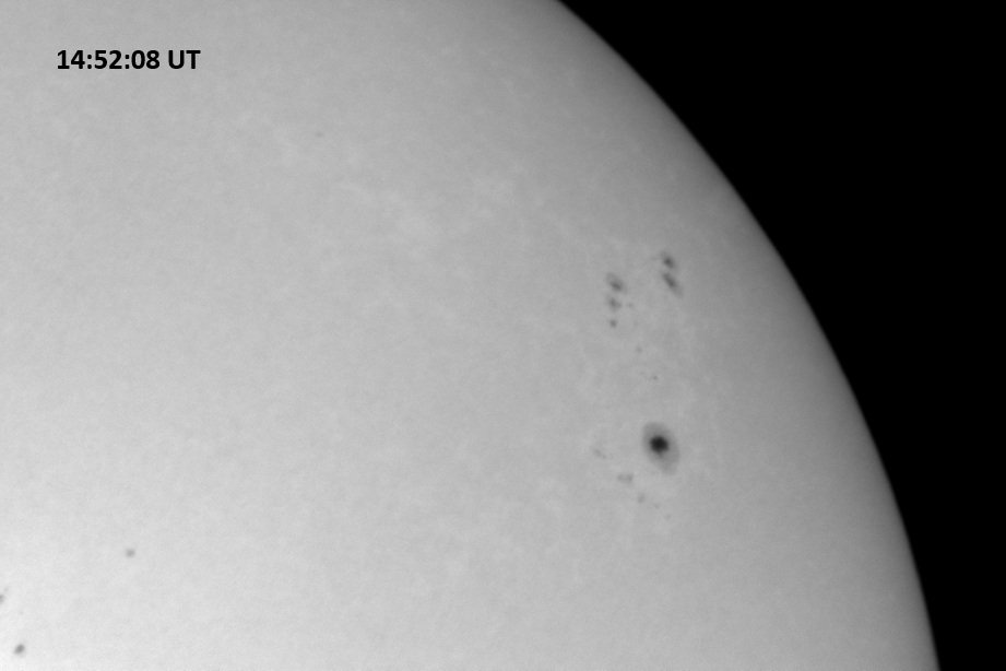 Weather was cloudy today but the clouds thinned enough to allow the Sun to shine through fairly strongly. This was enough for a complete set of continuum images, although they were made through cirrostratus clouds of varying thickness. H-alpha imaging was attempted, unsuccessfully, due to even the presence of thin clouds greatly reducing the contrast.