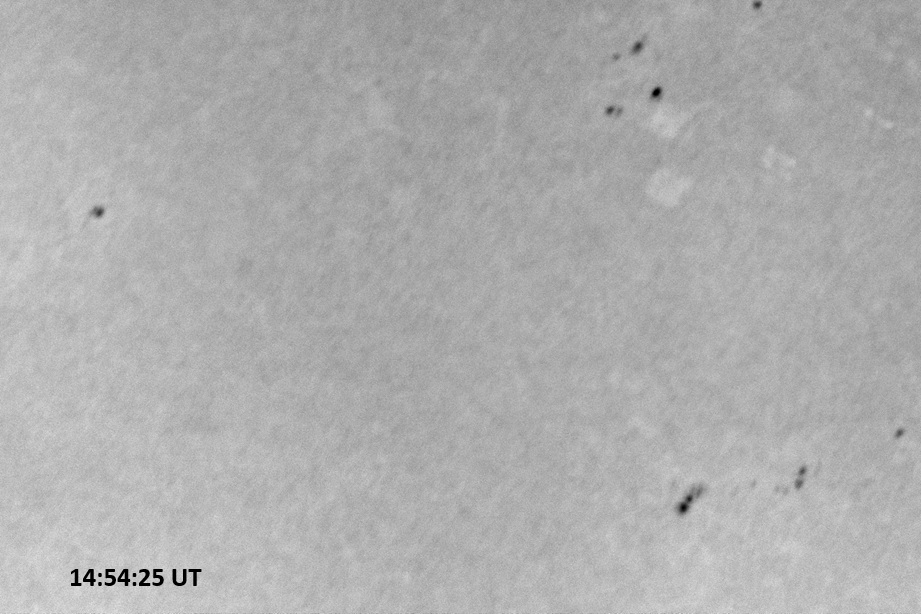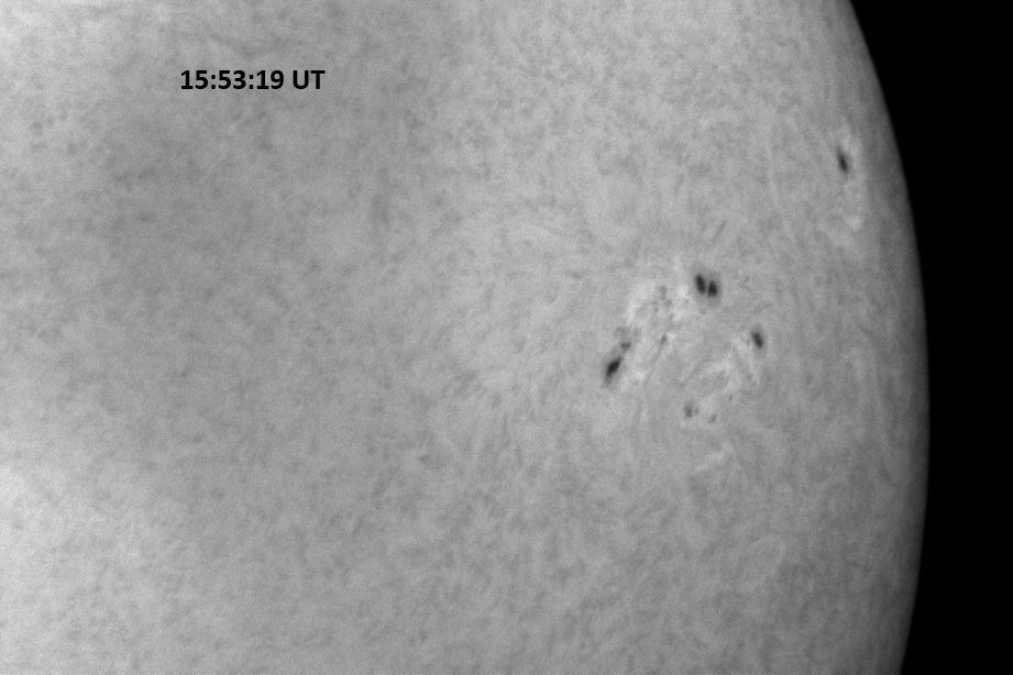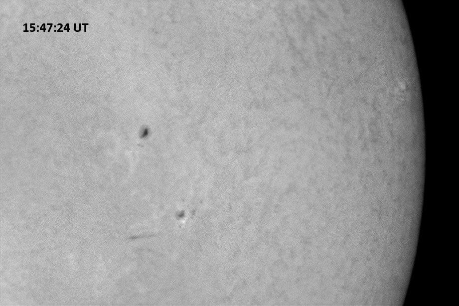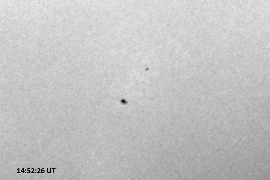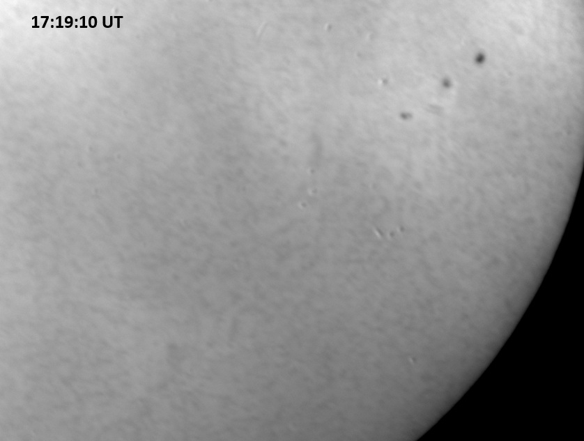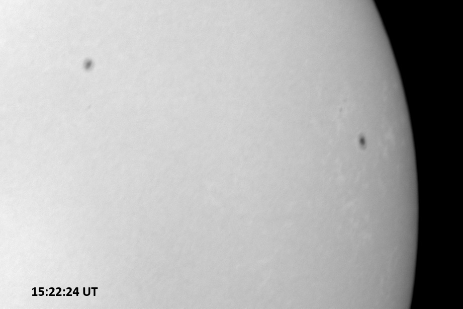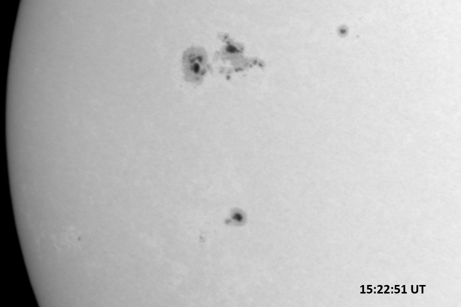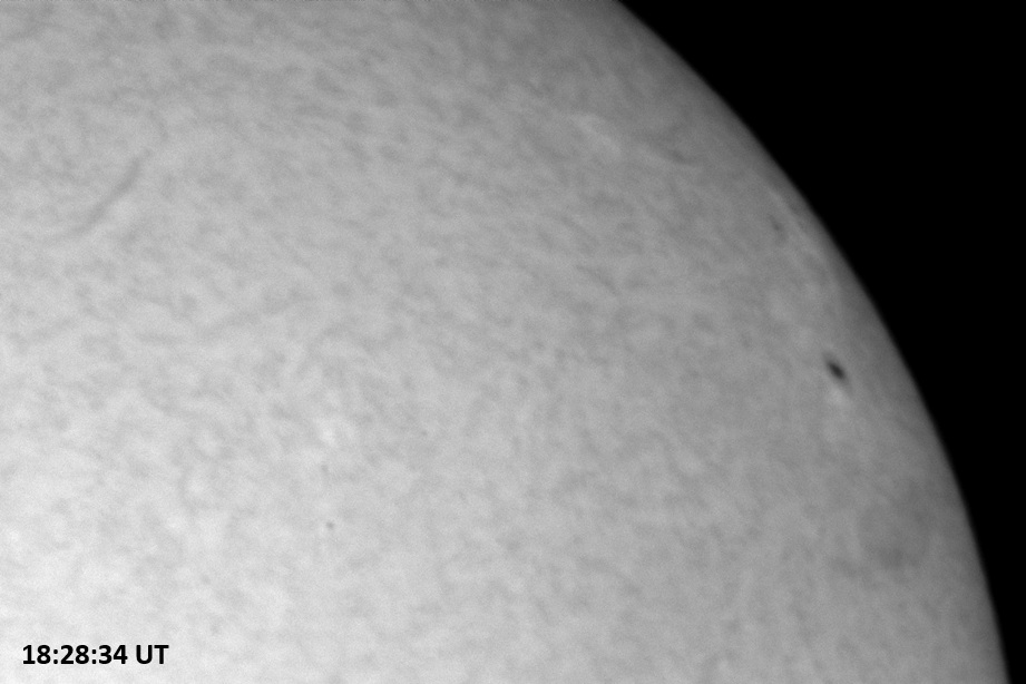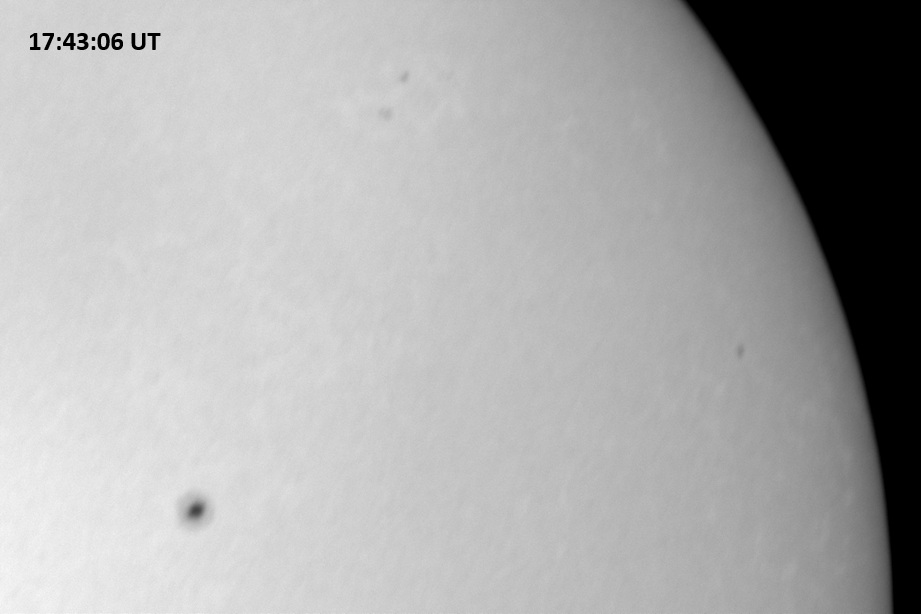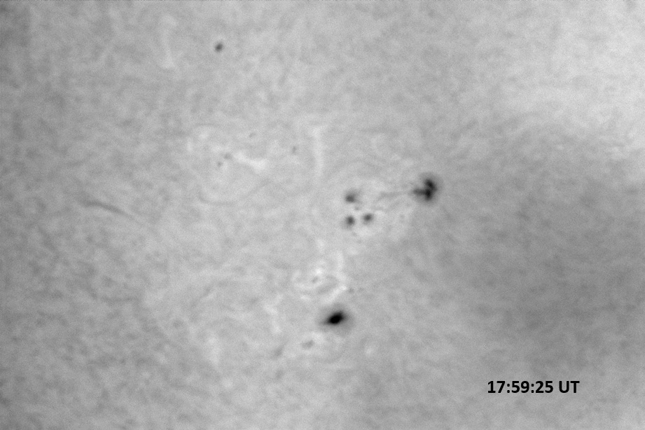 Weather was cloudy today but the clouds thinned enough to allow the Sun to shine through fairly strongly. This was enough for a complete set of continuum images, although they were made through cirrostratus clouds of varying thickness. H-alpha imaging was attempted, unsuccessfully, due to even the presence of thin clouds greatly reducing the contrast.