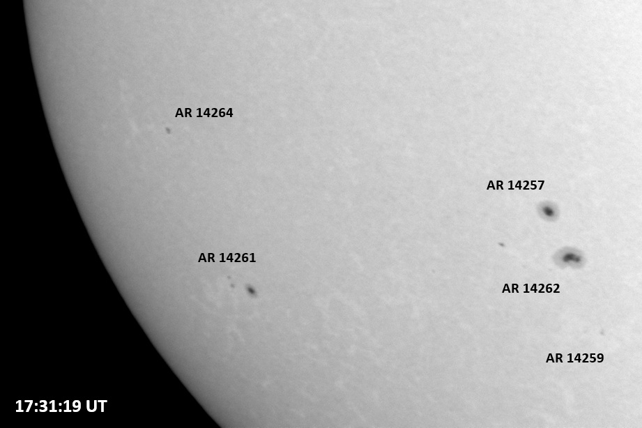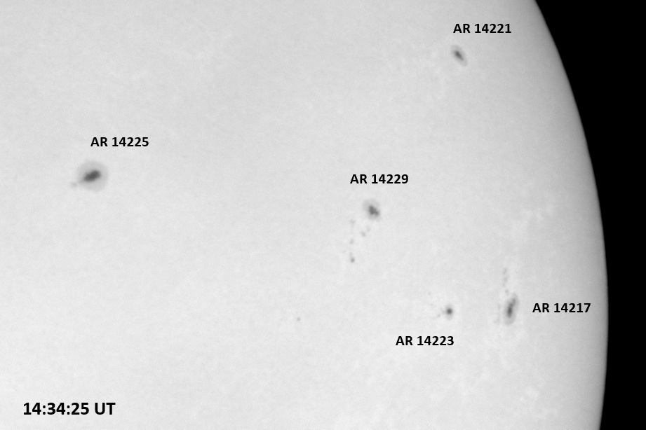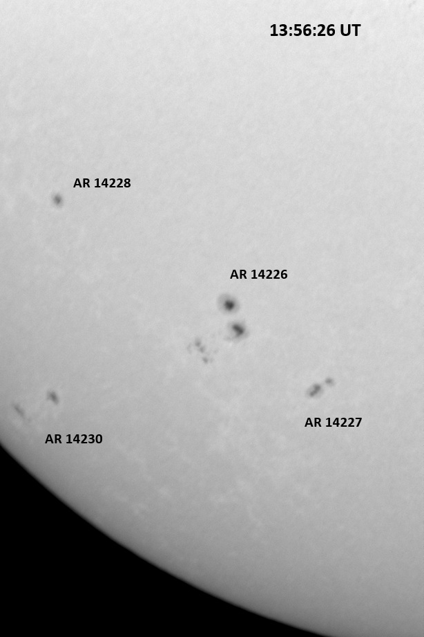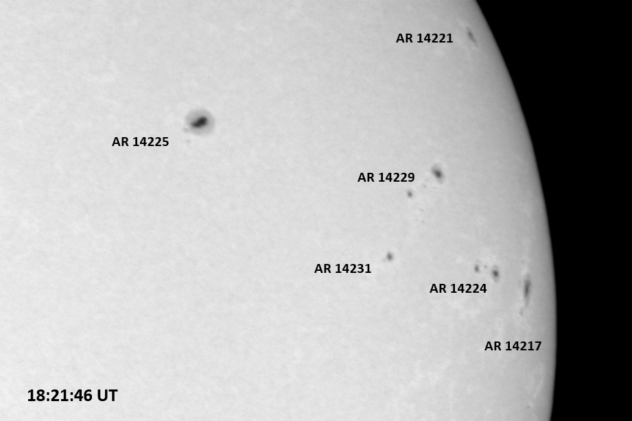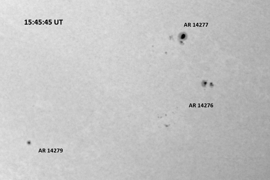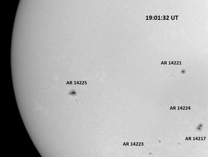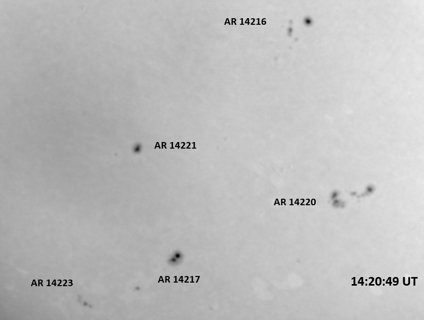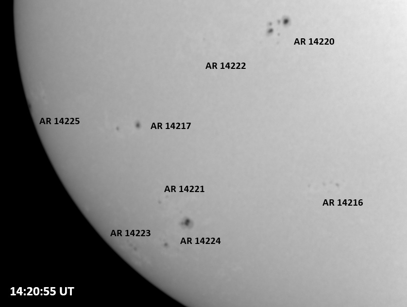 The power cord for the H-alpha filter was unavailable so only continuum images were taken during one short session today. The below is two copies of the same field of view, which includes all but one of the active regions currently visible on the solar disk. The image was taken at the time indicated and is shown in both labeled and un-labeled format. The image, a 0.25 second exposure, covers 13.8’x18.0′ on the Sun.