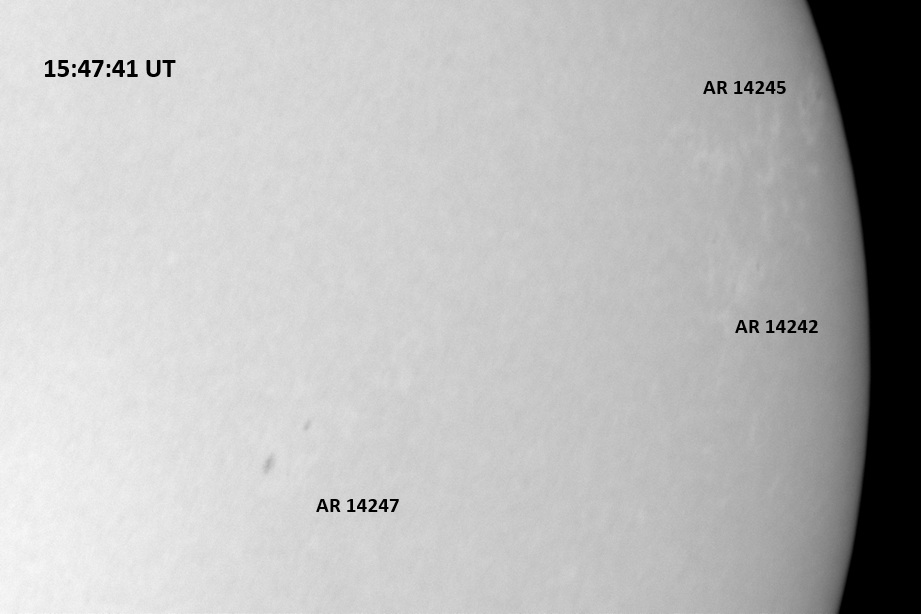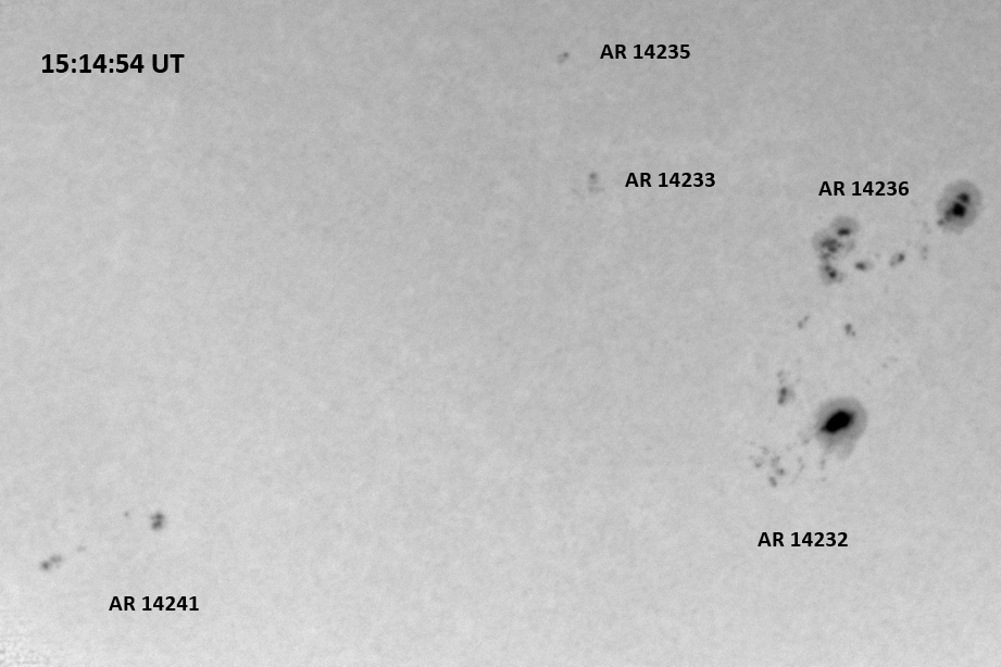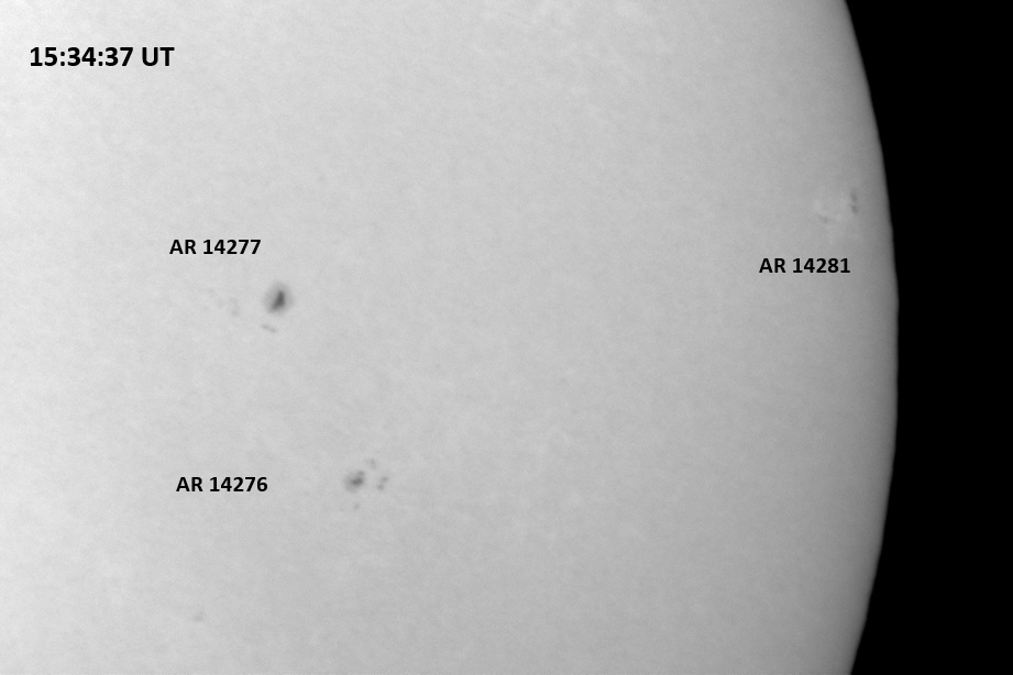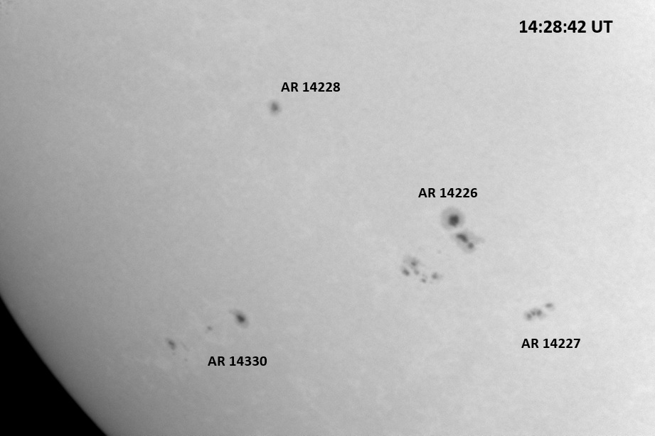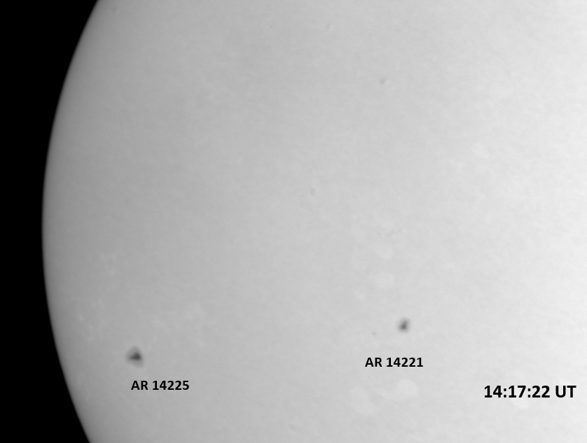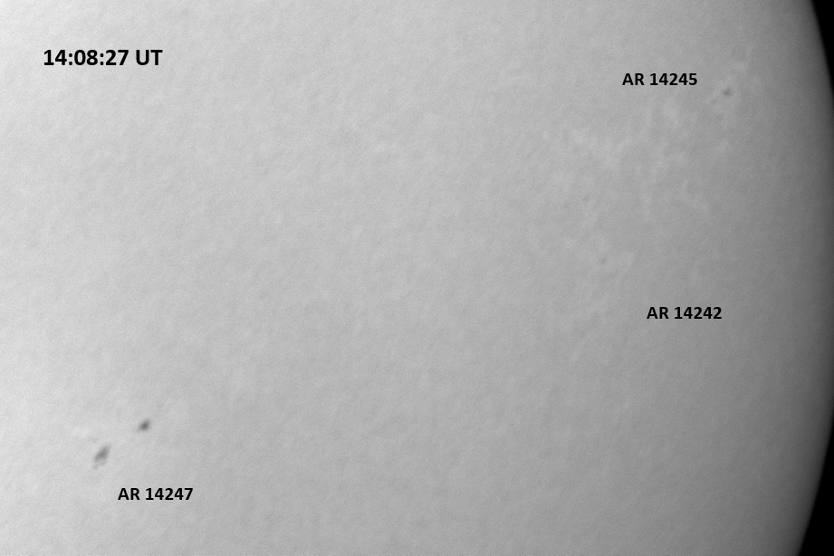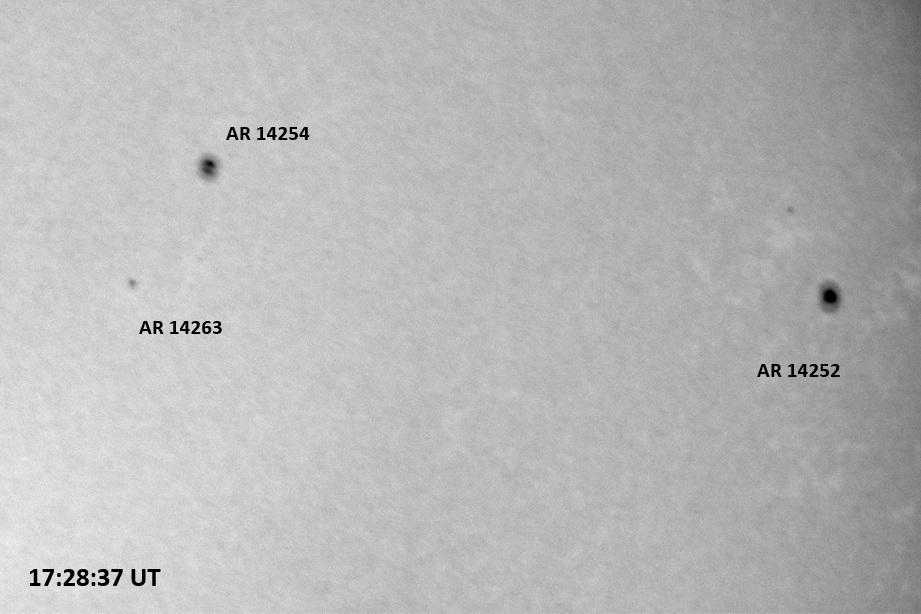 The power cord for the H-alpha filter was unavailable so only continuum images were taken during one short session today. The below is two copies of the same field of view, which includes all but one of the active regions currently visible on the solar disk. The image was taken at the time indicated and is shown in both labeled and un-labeled format. The image, a 0.25 second exposure, covers 13.8’x18.0′ on the Sun.