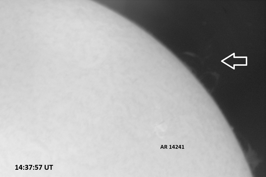 Solar activity remains at moderate levels due to ongoing M-class flare activity. AR 14246 underwent some significant evolution, gaining size and new spots, and was the primary source of activity, including an M1.2 flare at 13:18 UTC on 13 October, an M2.0 at 12:47 UT today (14 October) and an M3.1 at 20:36 UT today. It also produced numerous C-class flares (16 so far today and counting, four of which occurred during our observing session) and optical flares. All of this activity has launched several CMEs into space, with potential Earth-directed components. A prominence erupted off the ENE limb of the Sun, first observed by satellite after 0:36 UT, 14 October. The debris is not Earth-directed.