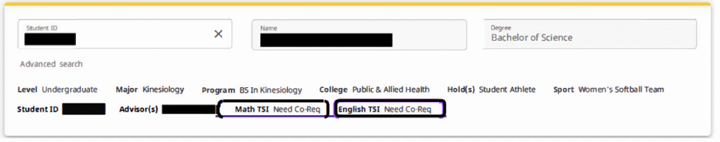 All Students who are ‘Not College Ready’ in any area for TSI will show either or both (see example below) ‘Math TSI Need Co-Req’ and/or ‘English TSI Need Co-Req’ in Degree Works. You must meet with your assigned Academic Advisor to determine the appropriate college level English and/or Math and co-requisite courses you need based on your TSI Assessment scores and major.