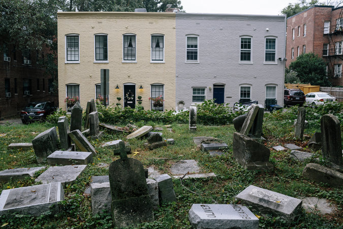 On one side is Oak Hill, a lush slope of well-tended graves of congressmen, publishers and cabinet members who were, with few exceptions, white. On the other side is the Mount Zion and Female Union Band Society Cemetery. There, broken gravestones lie in large piles and dogs and their owners have taken the place of mourners for the slaves, freedmen and mostly black citizens buried below.