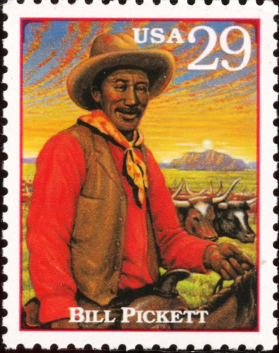 2 – On this date in 1932, Bill Pickett, the cowboy who invented the technique of “bulldogging” steers, passed away after being kicked in the head by a horse. On his radio show, Pickett’s friend Will Rogers announced the funeral at the 101 Ranch, near Ponca City, Okla., commenting: “Bill Pickett never had an enemy, even the steers wouldn’t hurt old Bill.” Known as the “Dusky Demon,” Pickett was a native of Taylor, northeast of Austin. In 1971, he became the first black man elected to the National Cowboy Hall of Fame and Western Heritage Center in Oklahoma. In 1993, the U.S. Postal Service honored him as part of its Legends of the West series of stamps.