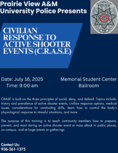 The Prairie View A&M Police Department is pleased to announce an upcoming Civilian Response to Active Shooter Events (C.R.A.S.E.) course, designed to equip our campus community with critical knowledge and strategies for responding to active threat situations.